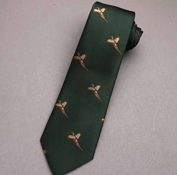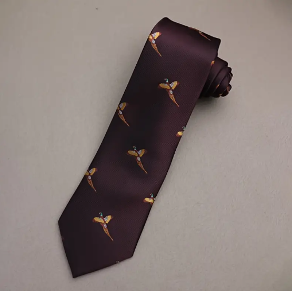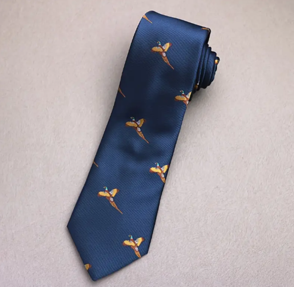 The pheasant tie is a versatile accessory suitable for both men and women. This multicoloured tie features a design of pheasant pattern, adding a touch of elegance and uniqueness to any outfit. Perfect for formal occasions or adding a pop of colour to a smart-casual look, this tie is sure to make a statement and elevate your style.